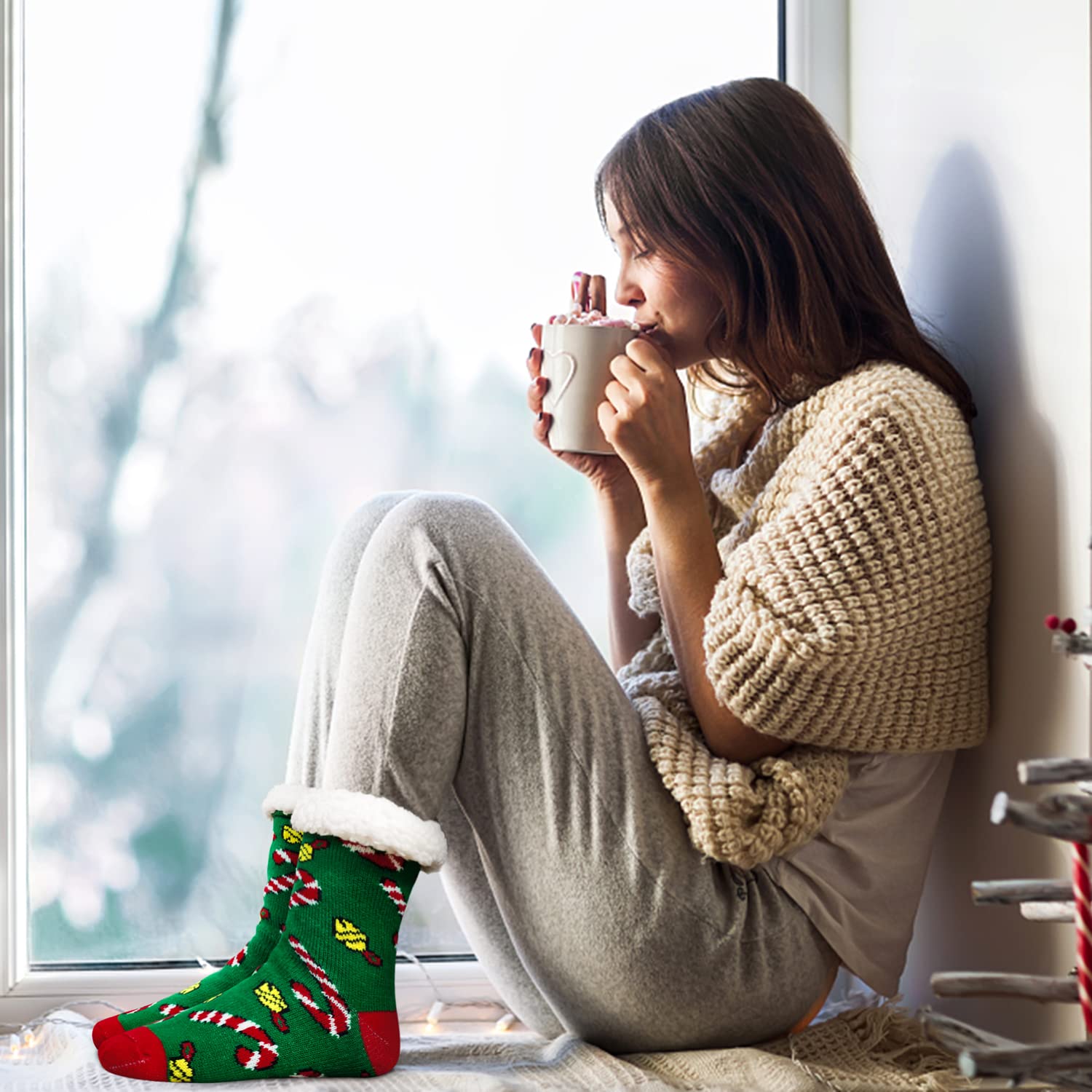 Junely Christmas Slipper Socks for Women with Grippers Non Slip Fuzzy Grip Winter Warm Cozy Thick Comfy Soft Fleece Cabin Socks Green