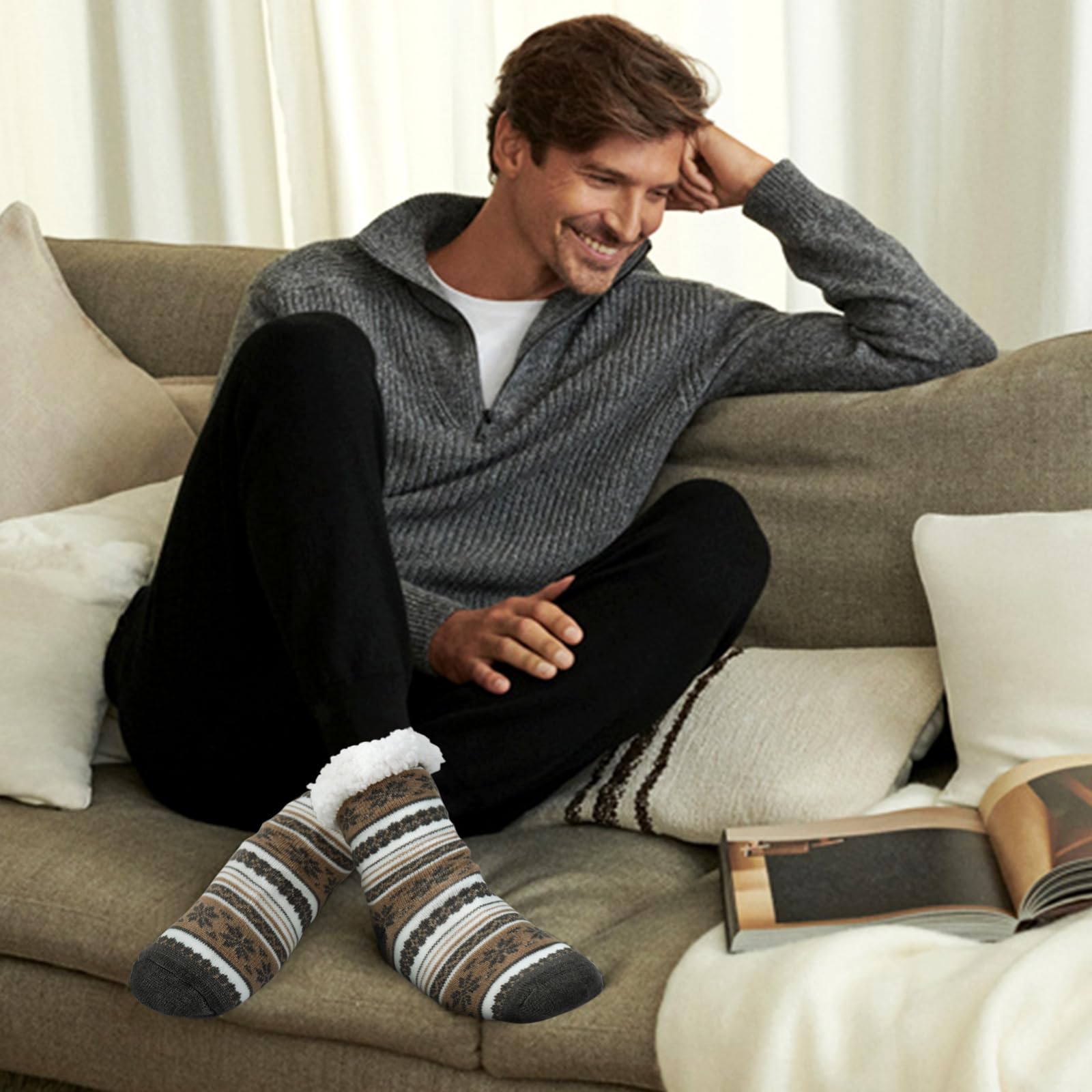 Junely Slipper Socks for Men with Grippers Fuzzy Cozy Fluffy Non Slip Warm Winter Thick Comfy Soft Fleece Cabin Socks Christmas Gifts Snowflake Brown