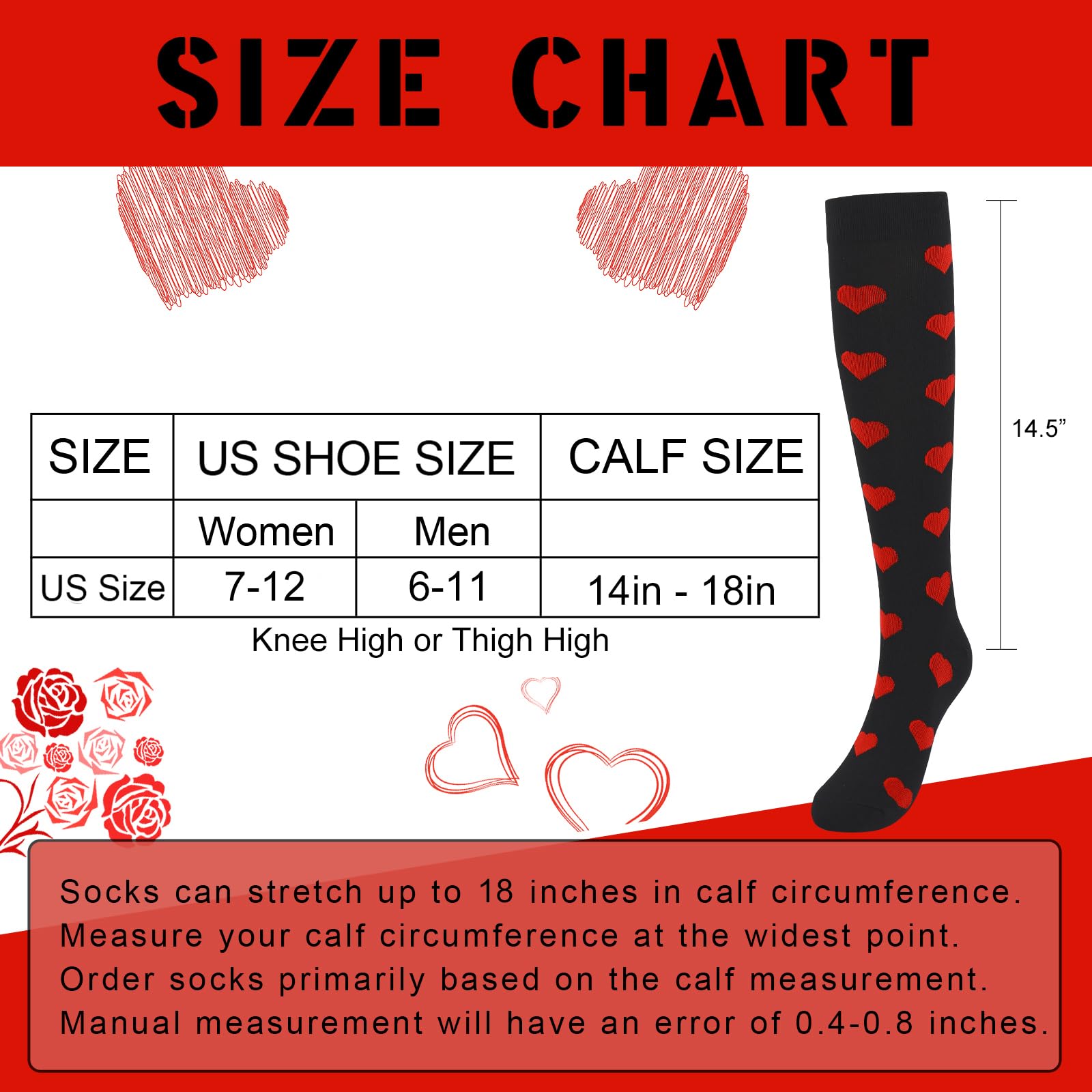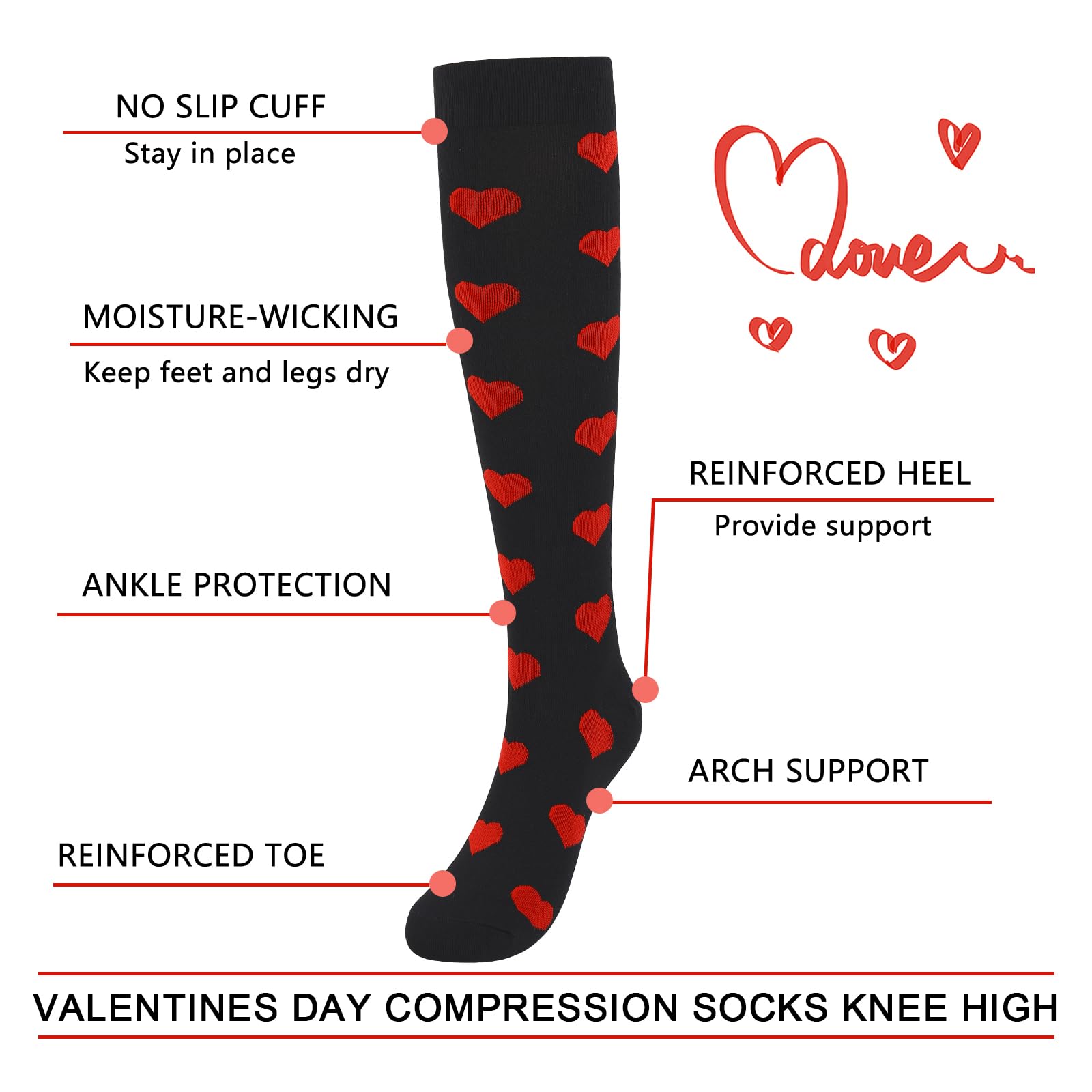 Junely Valentines Day Compression Socks for Women 20-30 mmhg Heart Knee High Socks for Valentine Running Athletic Nurses Pregnant Women Work Support Travel Flight Sports Black