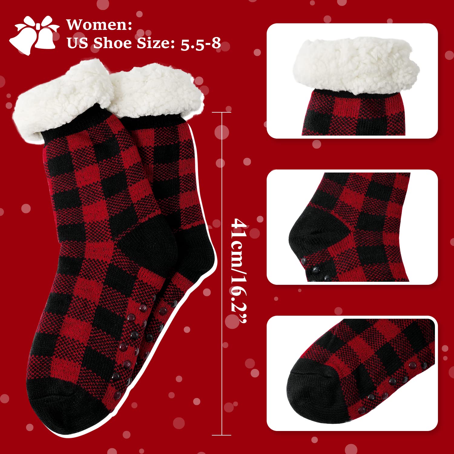 Junely Christmas Slipper Socks with Grippers for Women Non Slip Fuzzy Fluffy Cozy Warm Soft Comfy Thick Fleece Cabin Socks Red Buffalo Plaid