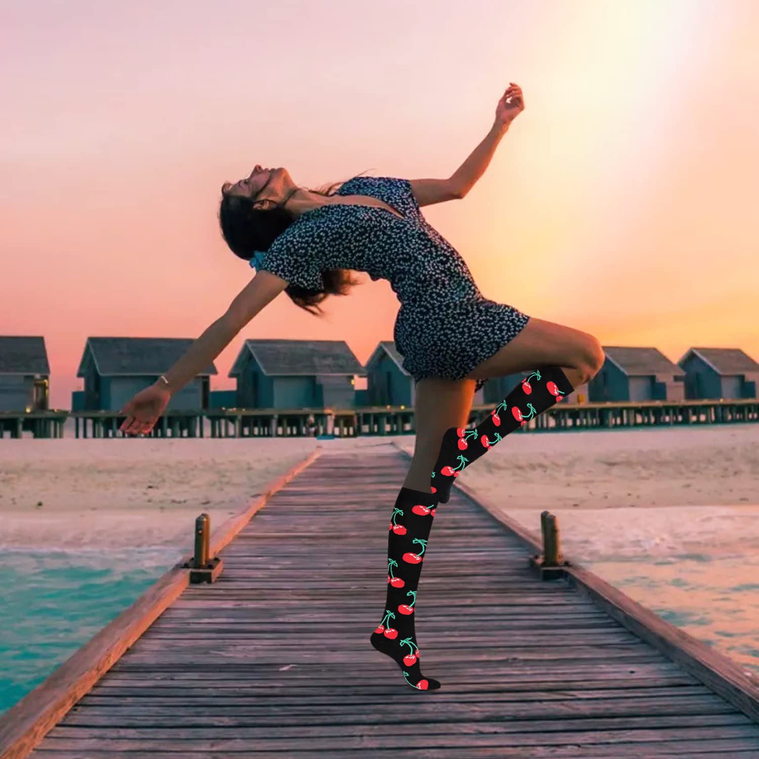 Junely Compression Socks for Women 20-30 mmhg Cherry Knee High Socks for Running Athletic Nurses Pregnant Women Work Support Travel Flight Sports Black