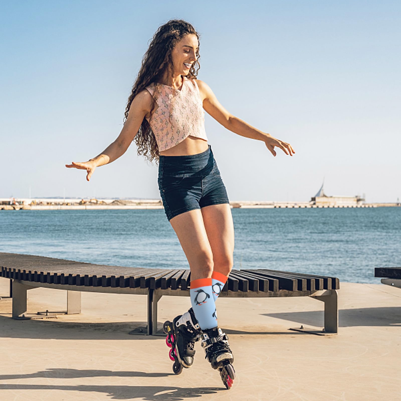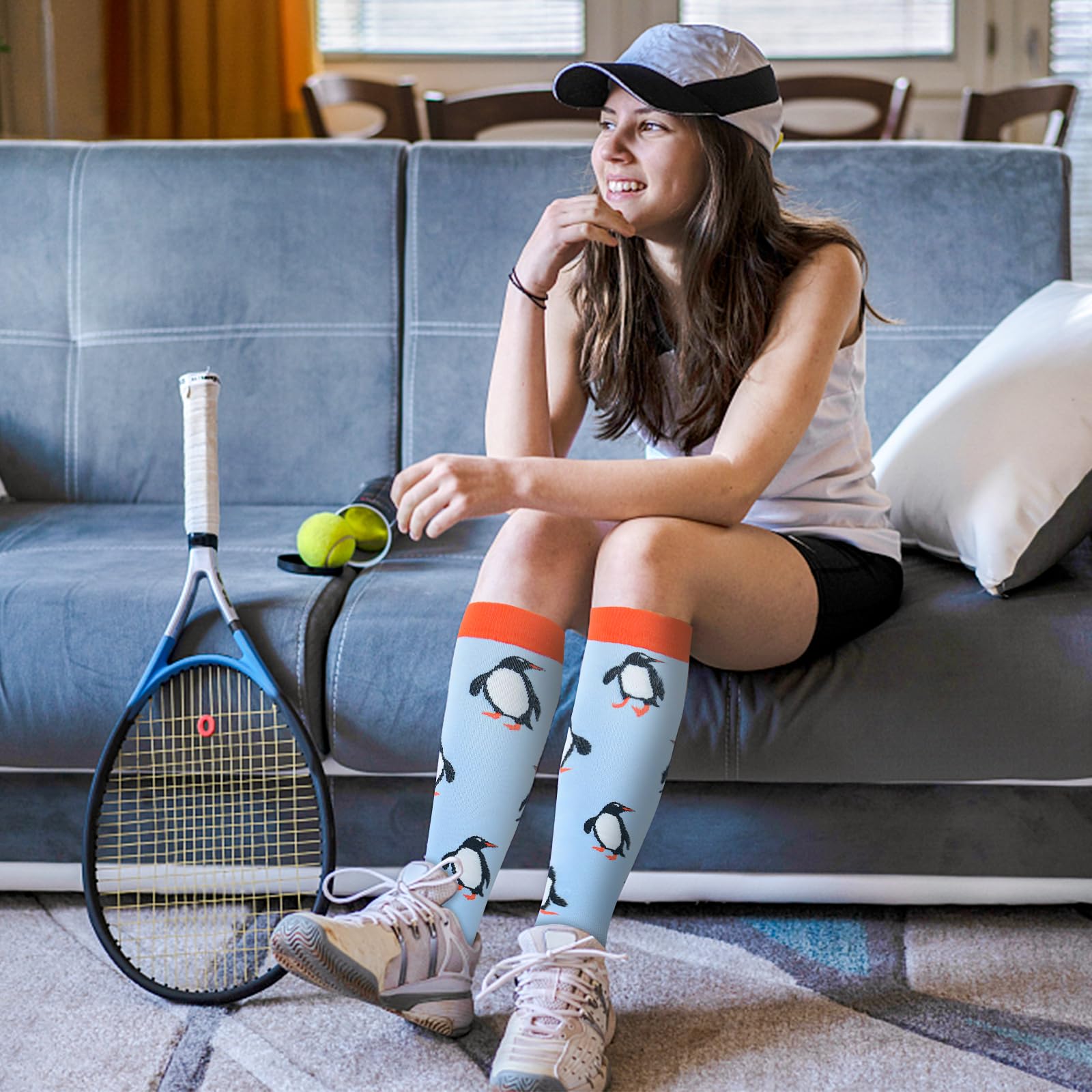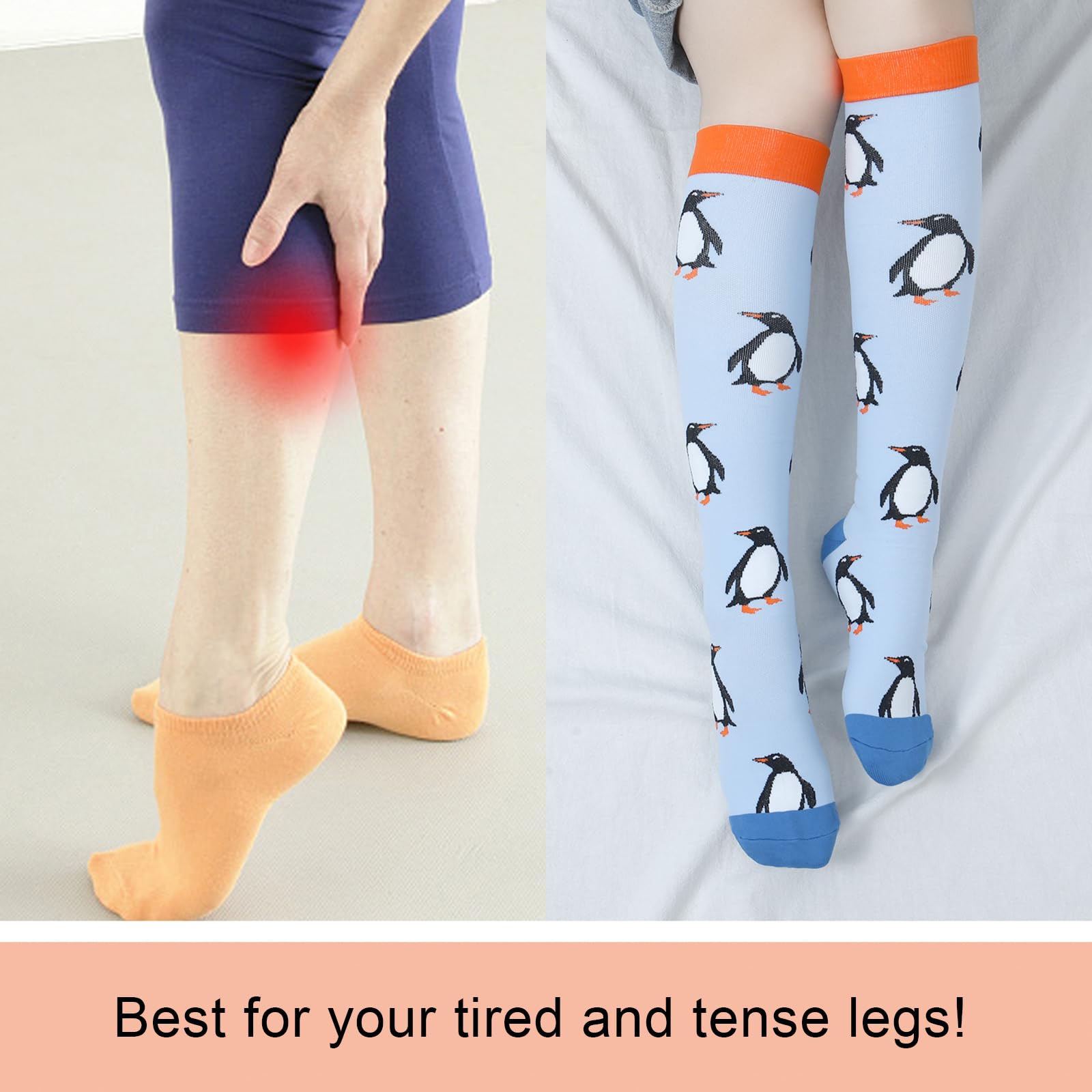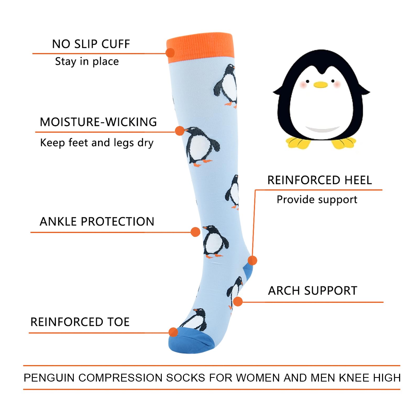 Junely Compression Socks for Women 20-30 mmhg Penguin Knee High Stockings for Running Athletic Nurses Pregnant Women Work Support Travel Flight Sports Penguin Gifts Blue