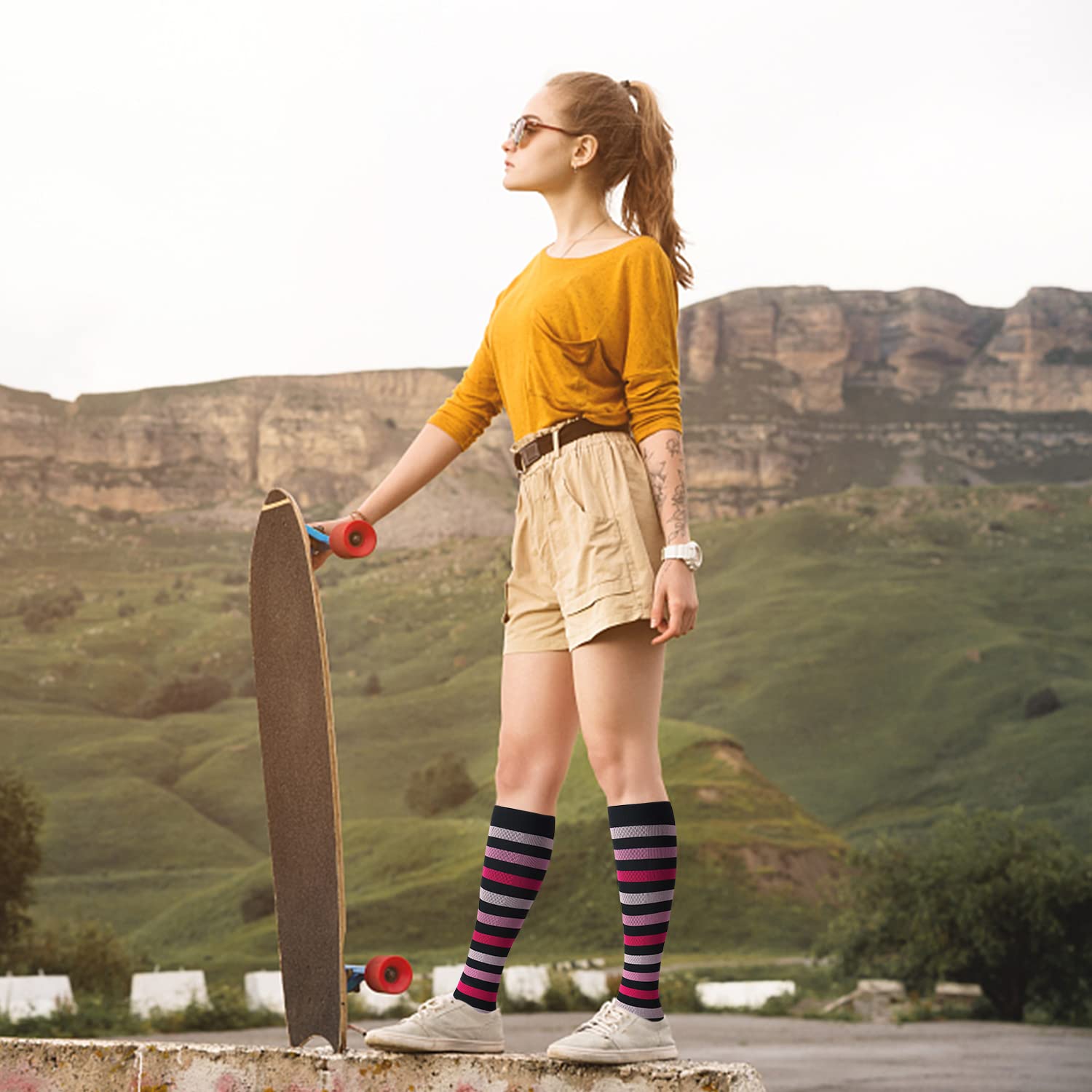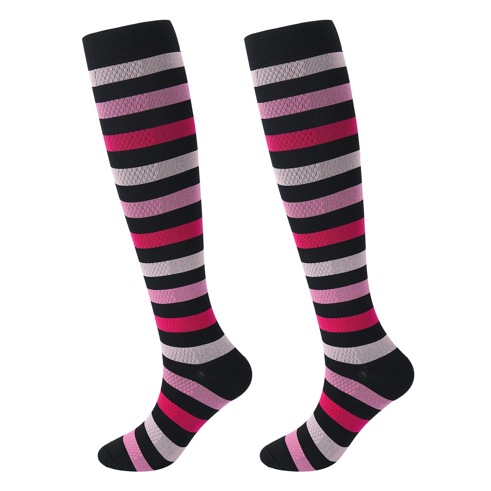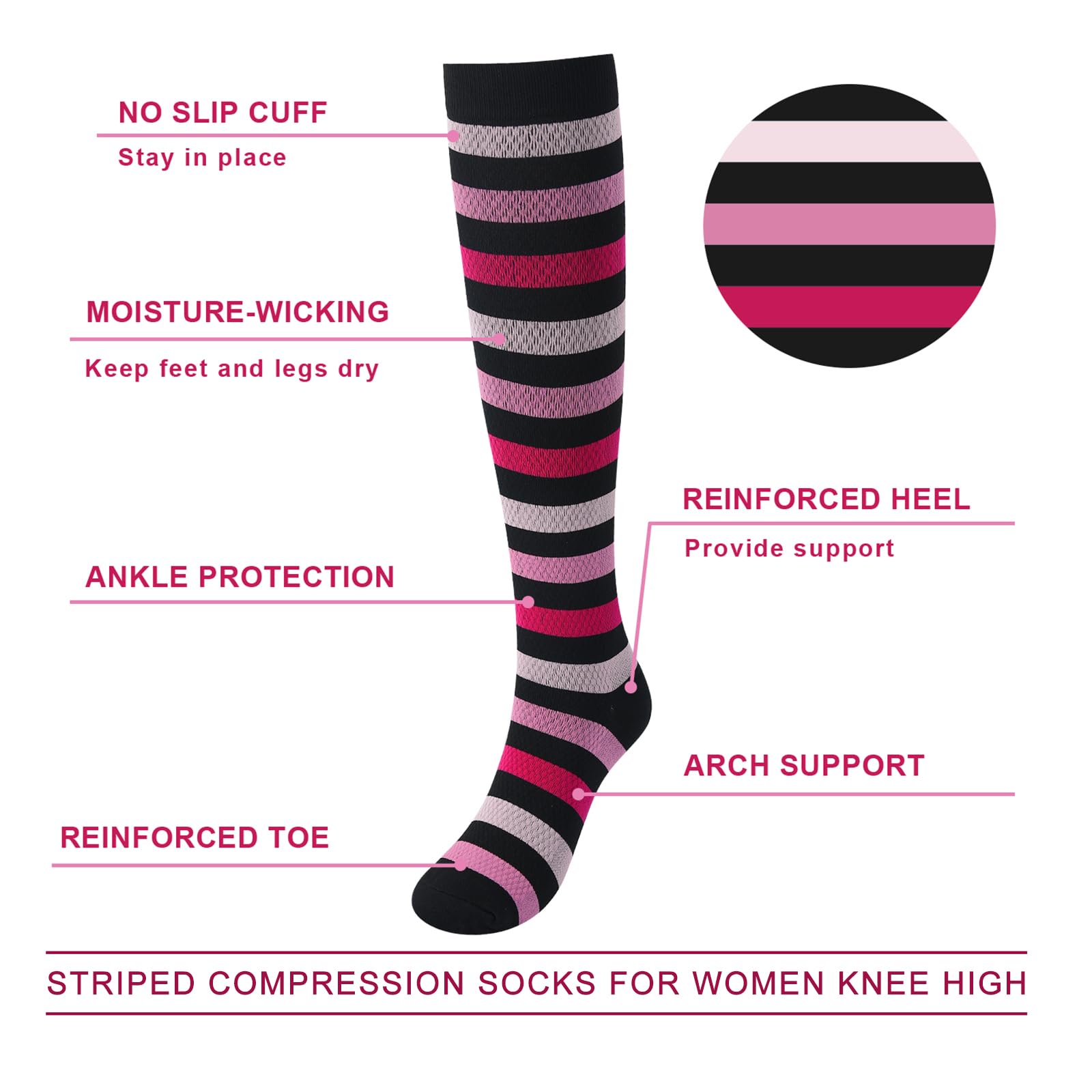 Junely Compression Socks for Women 20-30 mmhg Striped Knee High Stockings for Running Athletic Nurses Pregnant Women Work Support Travel Flight Sports Pink