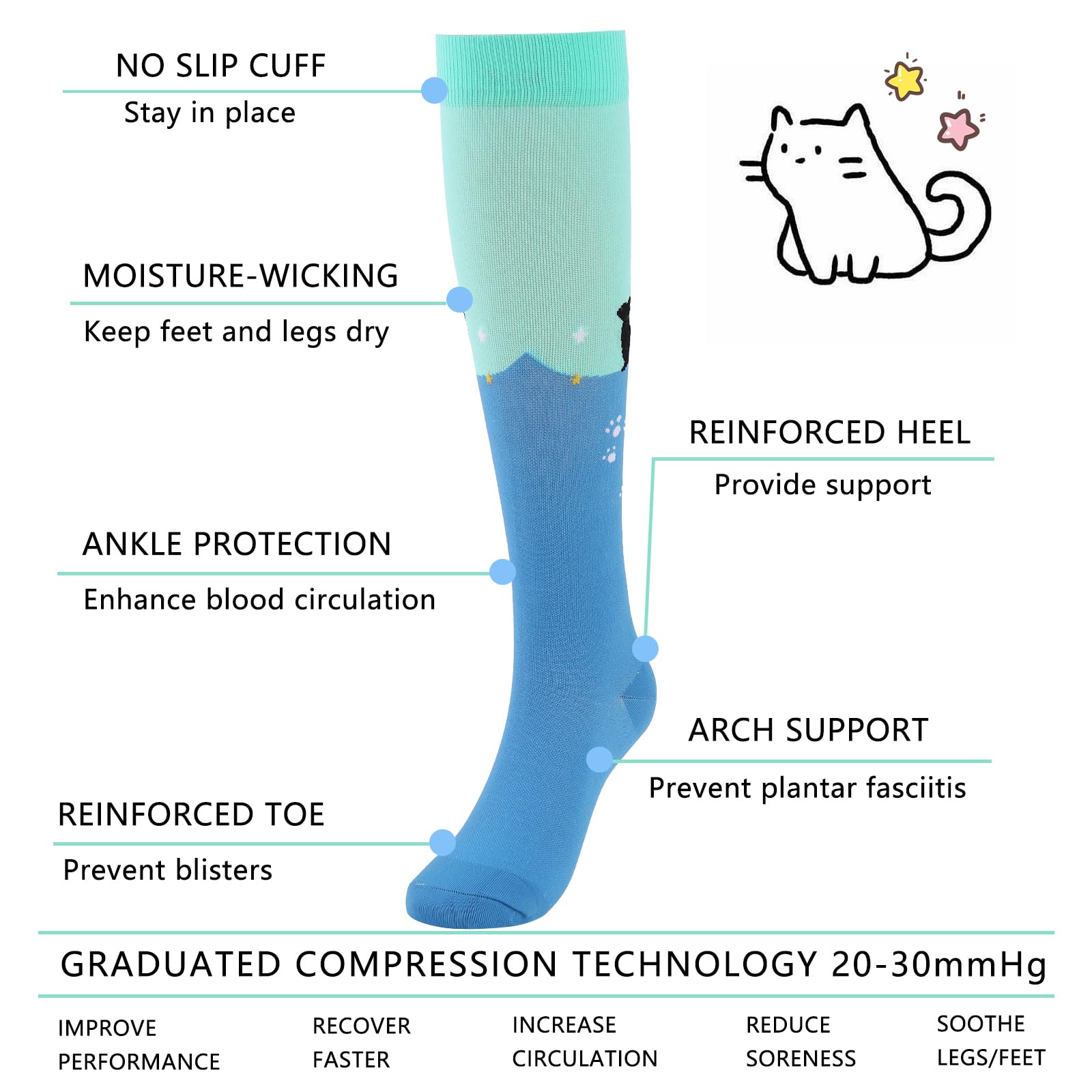 Junely Compression Socks for Women Cat Knee High Stockings for Running Athletic Nurses Pregnant Women Work Support Travel Flight Sports Gifts White Blue Yellow
