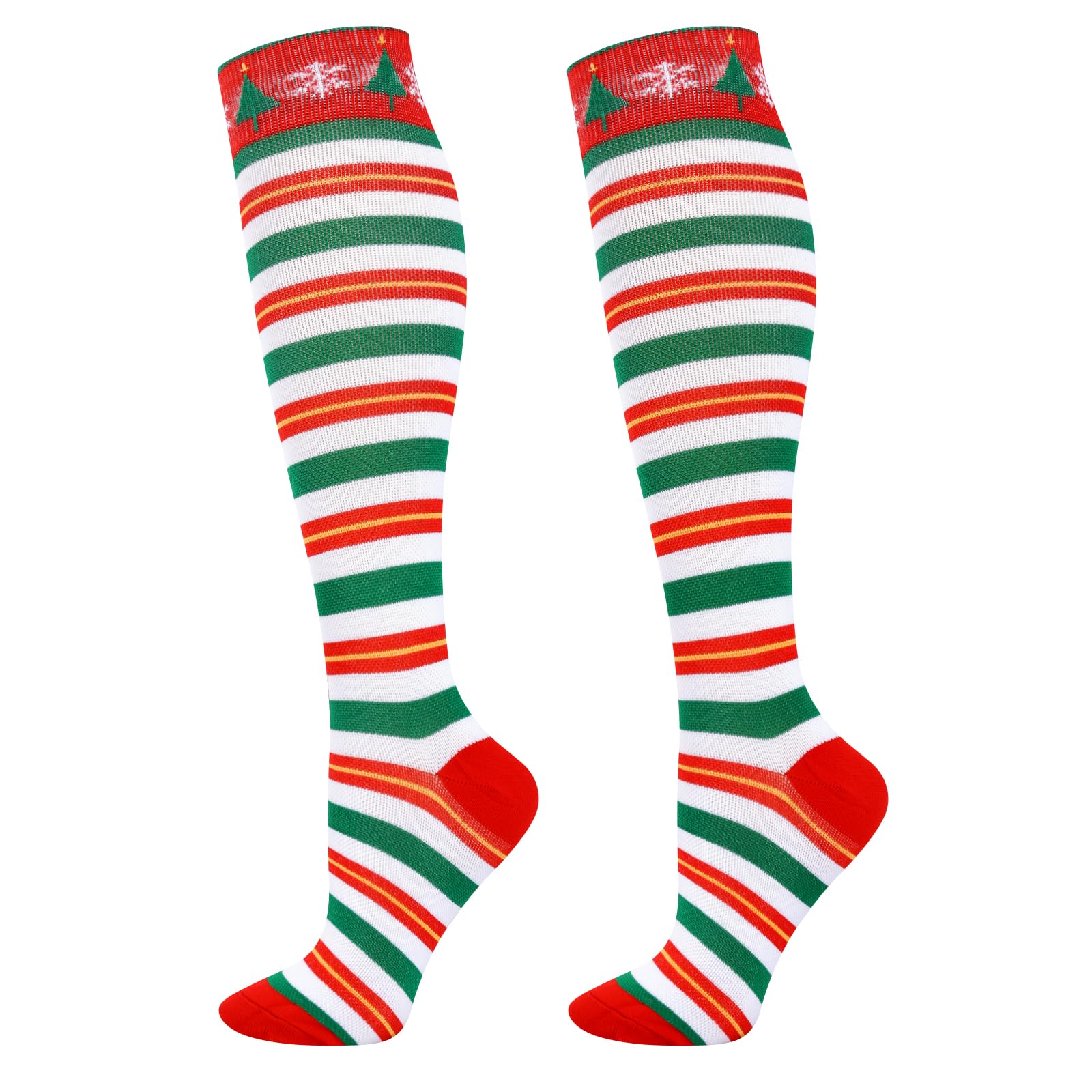 Junely Compression Socks for Women Christmas Striped Knee High Stockings for Running Athletic Nurses Pregnant Women Work Support Travel Flight Sports Gifts Red Green