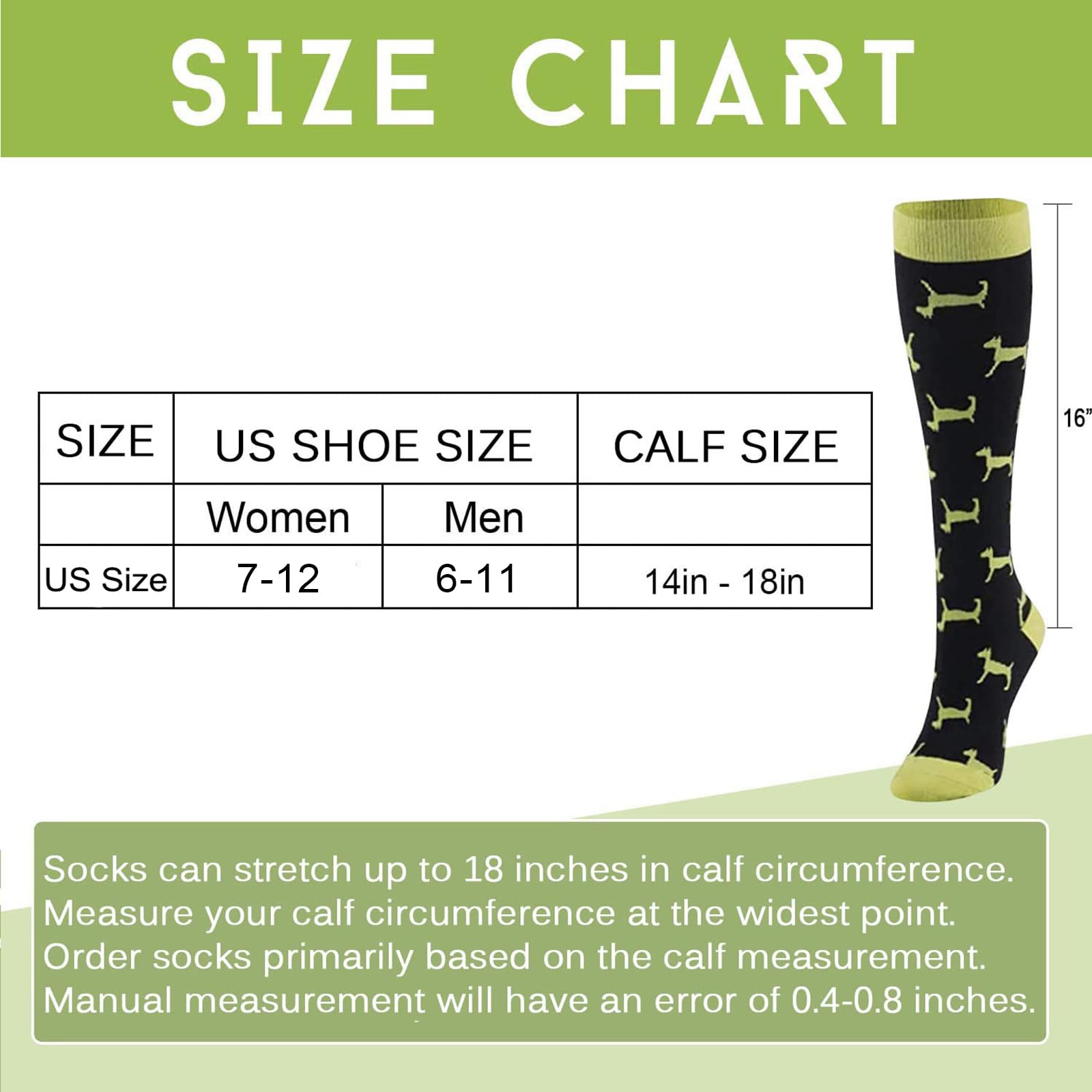 Dog Knee High Socks for Women: The ladies compression socks with dogs are ideal gifts for dog lovers. The breathable and light compression socks for women are easy to match dog costumes for women. The compression stockings for women dog are multifunctional and work as maternity compression socks, compression socks for pregnant women, nurse compression socks, varicose vein compression socks, compression socks for air travel, plantar fasciitis compression socks, compression socks for travel and flight, compression socks for swelling, postpartum compression socks, post surgery compression socks, achilles tendon compression socks, varicose veins compression socks, compression socks for swollen feet, compression socks for shin splints, compression socks for elderly women, compression socks for work, after surgery socks, arthritis socks, etc. Best compression socks are accessories for nurses, pregnant women, athletes, healthcare workers, travelers, elders, etc. Womens dog socks promote blood circulation in calves and feet and provide support for muscles. The dog print compression socks for women are good at relieving aches, pains, swellings, sprains, cramps, varicose veins, plantar fasciitis, etc. These socks with dogs on them for women keep you energetic and comfortable all day. Our cute compression socks women are beneficial to your health, ideal dog lover gifts. Our cute dog socks can also add a touch of color to your daily life. Compression Hose for Women US Size Guide: Women 9-13, calf 14in - 18in. Men 8-12, calf 14in - 18in. Pressure Socks for Women Care Instructions: Machine washable/Hand wash. Package includes 3 pair of funny dog socks.