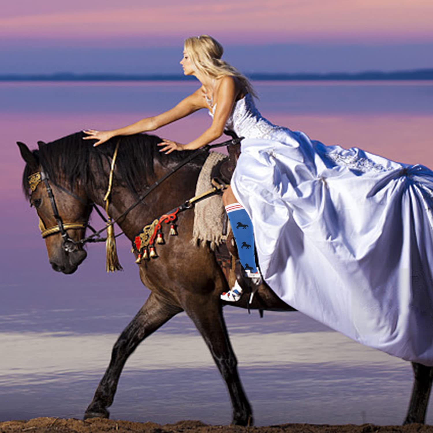 Junely Compression Socks for Women Horse Knee High Stockings for Running Athletic Nurses Pregnant Women Work Support Travel Flight Sports Horse Gifts Blue