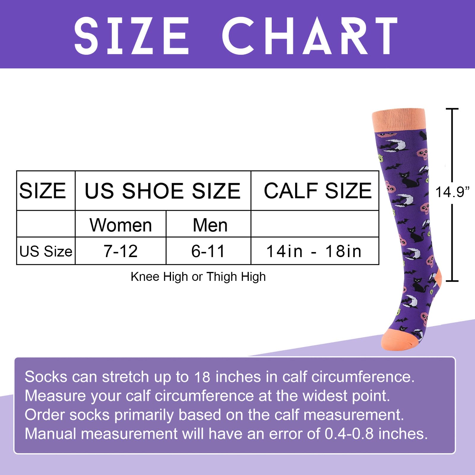 Knee High Halloween Socks for Women: The crazy compression socks for ladies with skeleton, skull, black cat, bat and moon, are horror socks, great for Halloween costumes for women. The breathable and light compression socks are easy to match cosplay costume. The Halloween softball socks are multifunctional and work as maternity compression socks, compression socks for pregnant women, nurse compression socks, varicose vein compression socks, compression socks for air travel, plantar fasciitis compression socks, compression socks for travel and flight, compression socks for swelling, postpartum compression socks, post surgery compression socks, achilles tendon compression socks, varicose veins compression socks, compression socks for swollen feet, compression socks for shin splints, compression socks for elderly women, compression socks for work, after surgery socks, arthritis socks, etc. Best compression socks are accessories for nurses, pregnant women, athletes, healthcare workers, travelers, elders, etc. Halloween stockings for women promote blood circulation in calves and feet and provide support for muscles. The Halloween soccer socks are good at relieving aches, pains, swellings, sprains, cramps, varicose veins, plantar fasciitis, etc. These tall Halloween socks keep you energetic and comfortable all day in fall. Our Halloween baseball socks are beneficial to your health, ideal gifts for cosplay lovers. Our cute Halloween socks can also add a touch of color to your daily life. Compression Hose for Women US Size Guide: Women 6-12, calf 14in - 16.5in. Men 5.5-11, calf 14in - 16.5in. Pressure Socks for Women Care Instructions: Machine washable/Hand wash. Package includes 1 pair of witch socks.