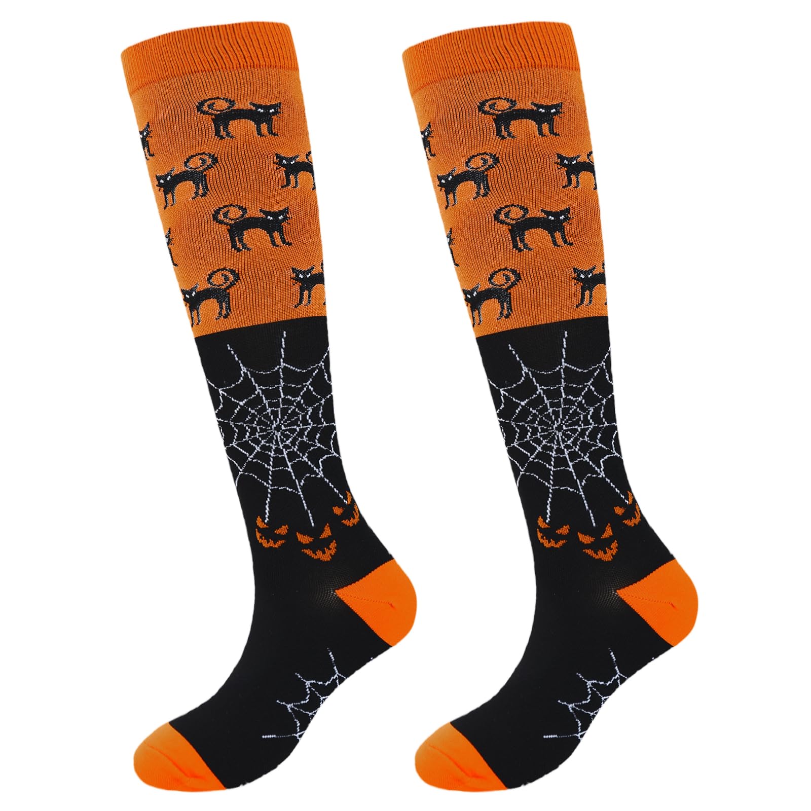 Junely Halloween Compression Socks for Women Knee High Cat Socks for Running Athletic Nurses Pregnant Women Work Support Travel Flight Sports Gifts Orange