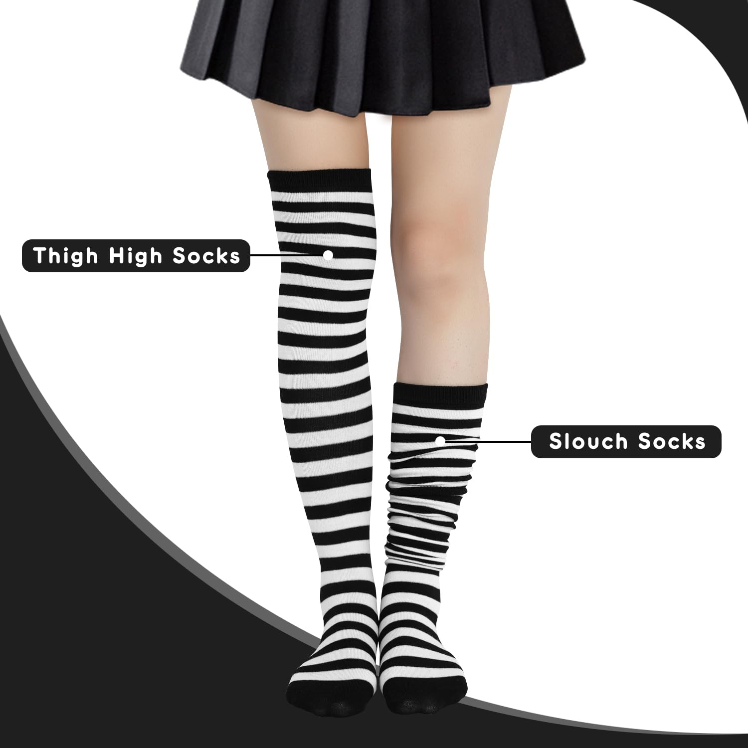 Junely Thigh High Socks and Gloves Black and White Striped Fingerless Gloves and Stockings Set Over the Knee Extra Long Christmas Cosplay Costume Accessories